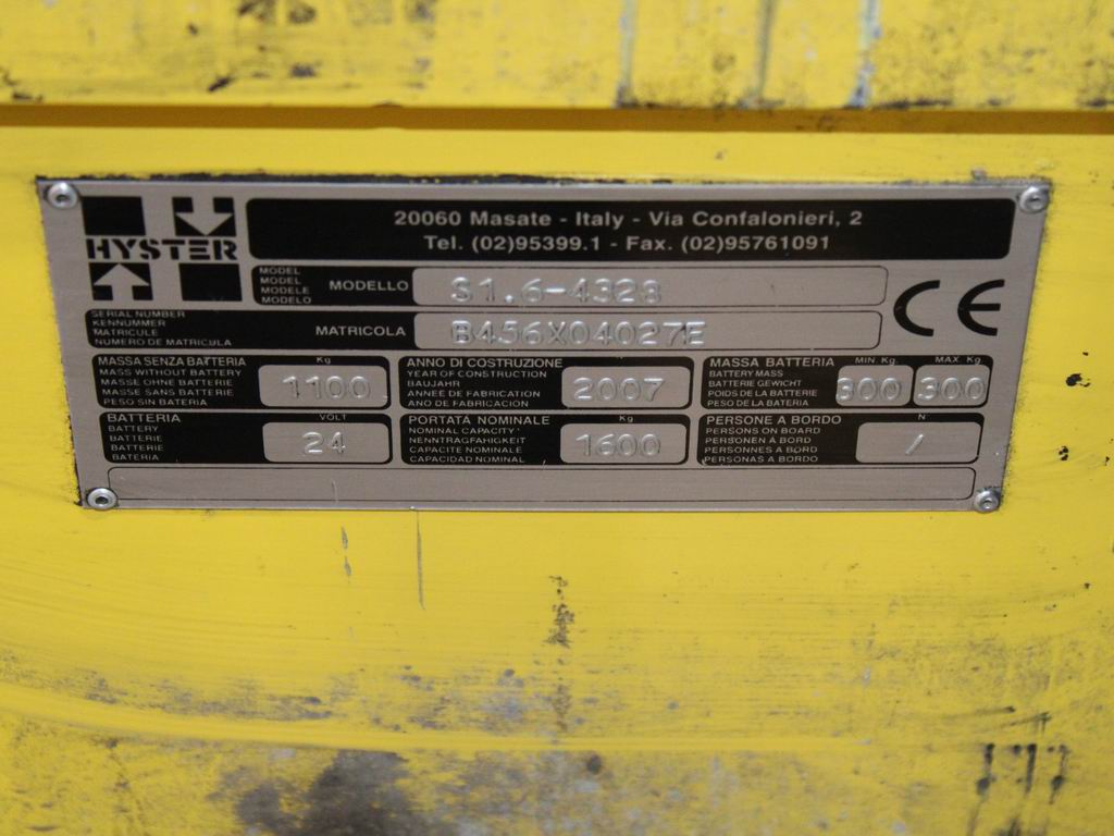 Hersteller: Hyster Typ: S 1.6-4328 Bauart: Hochhubwagen Antriebsart: Elektro Tragkraft: 1600 kg Baujahr: 2007 Betriebsstunden: 4522 |