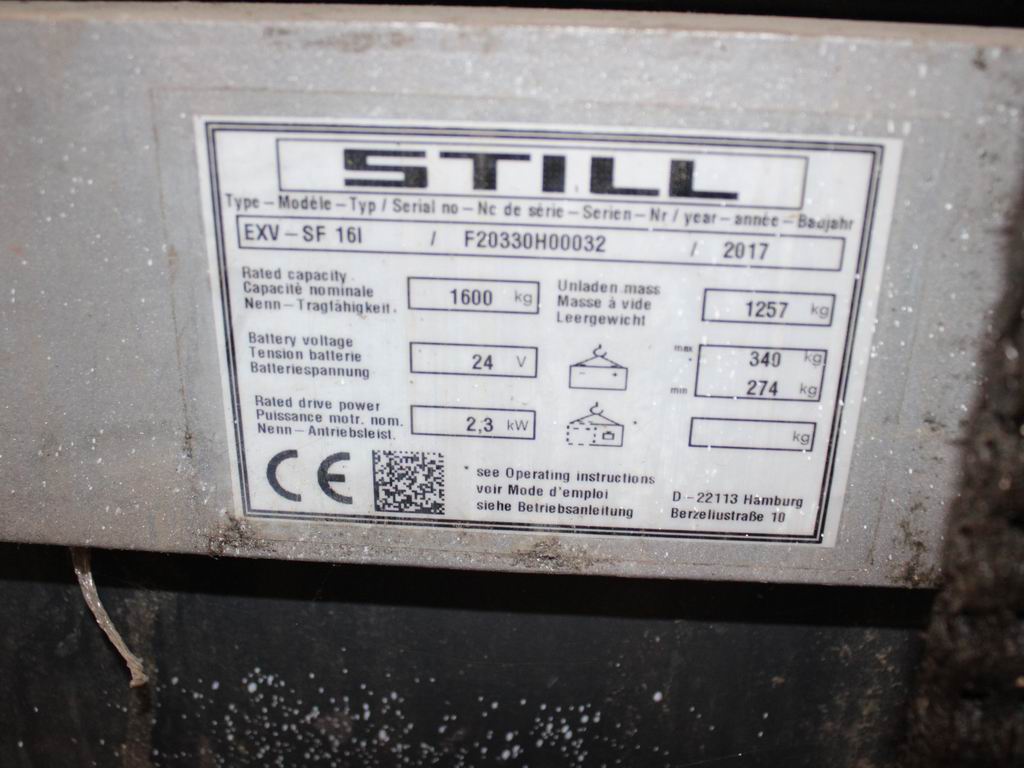 Hersteller: Still Typ: EXV-SF 16i Bauart: Hochhubwagen Antriebsart: Elektro Tragkraft: 1600 kg Baujahr: 2017 Betriebsstunden: 2992 |