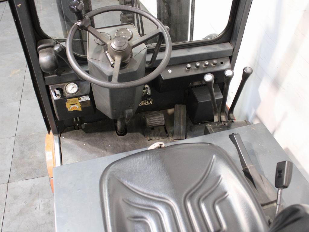 Masttyp: Triplex Hubhöhe: 4200 mm Freihub: 1300 mm Gabellänge: 1200 mm Reifen vorne: Superelastik Reifen vorne Größe: 2 x 200/50-10 Reifen vorne Zustand: 20 - 40% Reifen hinten: Superelastik Reifen hinten Größe: 2 x 15x 41/2-8 Reifen hinten Zustand: 60 - 80% |